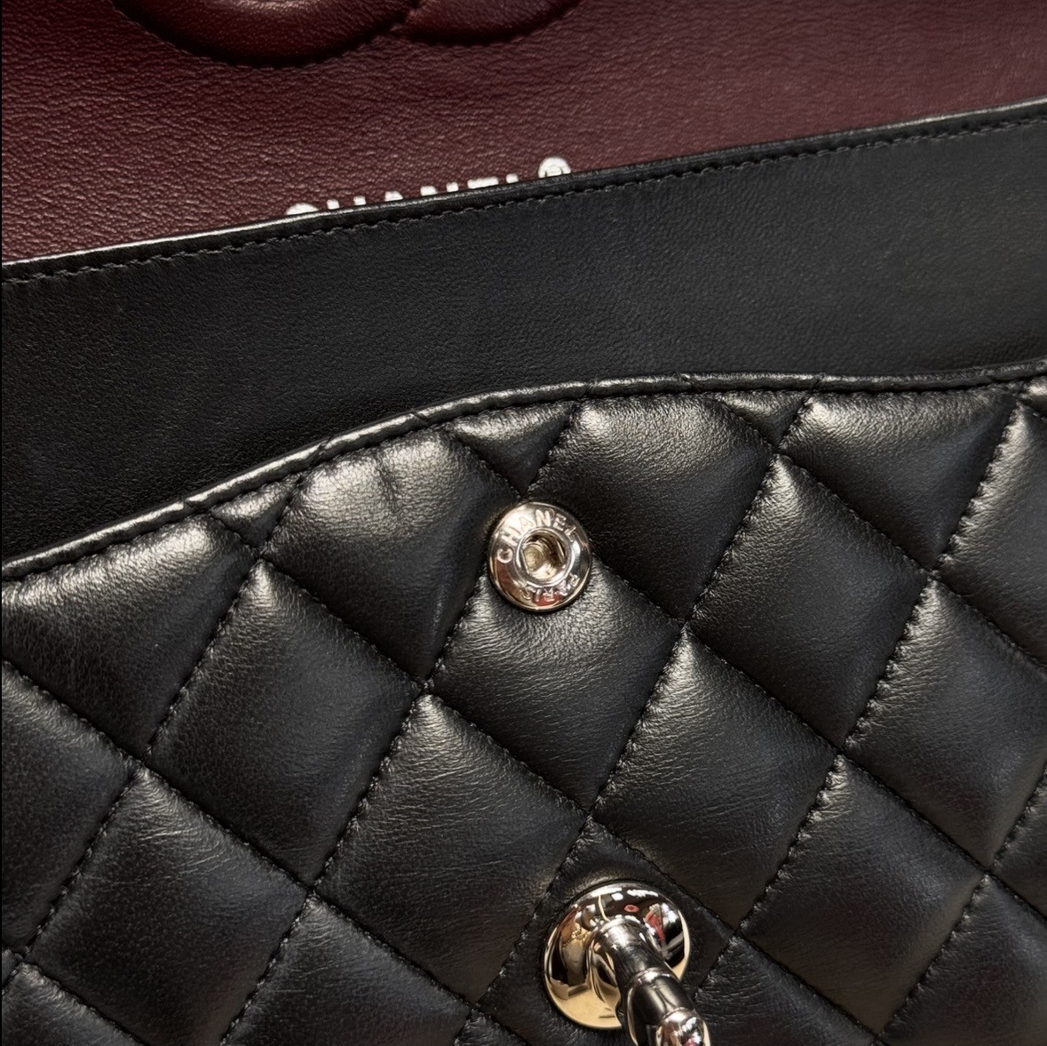 Chanel Jumbo Classica Maxi in black lambskin with gold hardware. Dimensions: 33 x 23 x 10 cm.