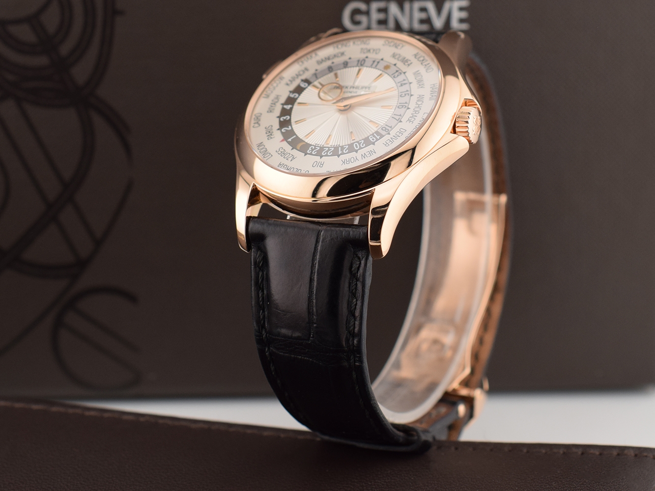 Produced in all four precious metals including yellow gold, pink gold, white gold, and platinum, the -018 variant is quite rare, with only two having ever been offered publicly. While aesthetically indistinguishable from the -001 variant, the present 5130R-018 features La Paz and Moscow on the outer ring, and Riyadh on the inner ring, while the -001 features Caracas and Dubai on the outer ring, and Moscow on the inner ring.