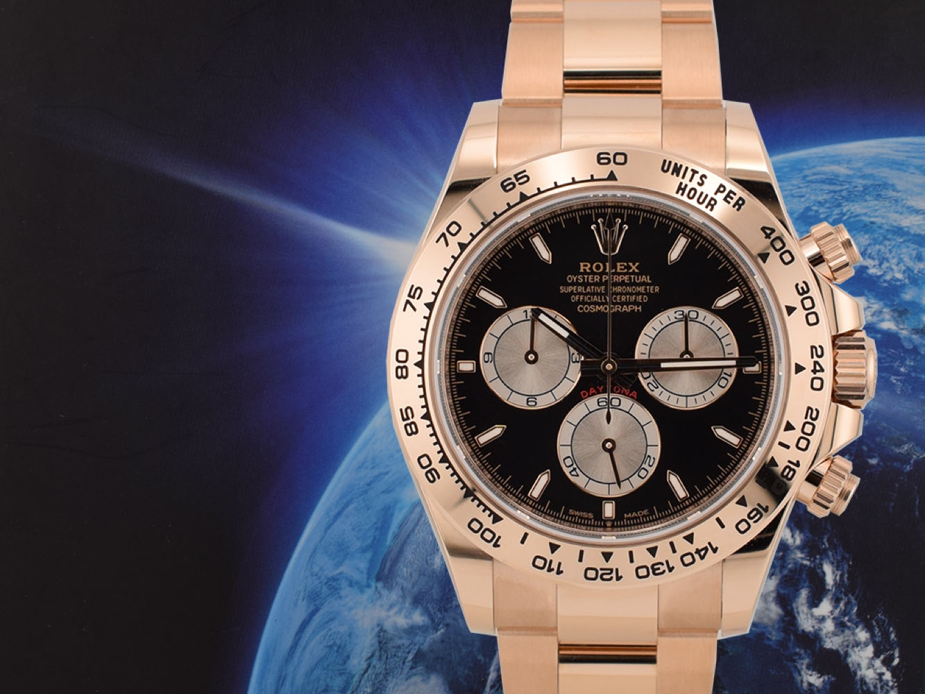 The Rolex Cosmograph Daytona, launched in 1963, is designed to meet the needs of professional pilots. The patented chronograph movement and the tachymeter scale allow pilots to measure the average speed of up to 400 kilometers per hour or - optionally - miles per hour. An icon that names and functions has always linked to the universe of high-performance automotive sports