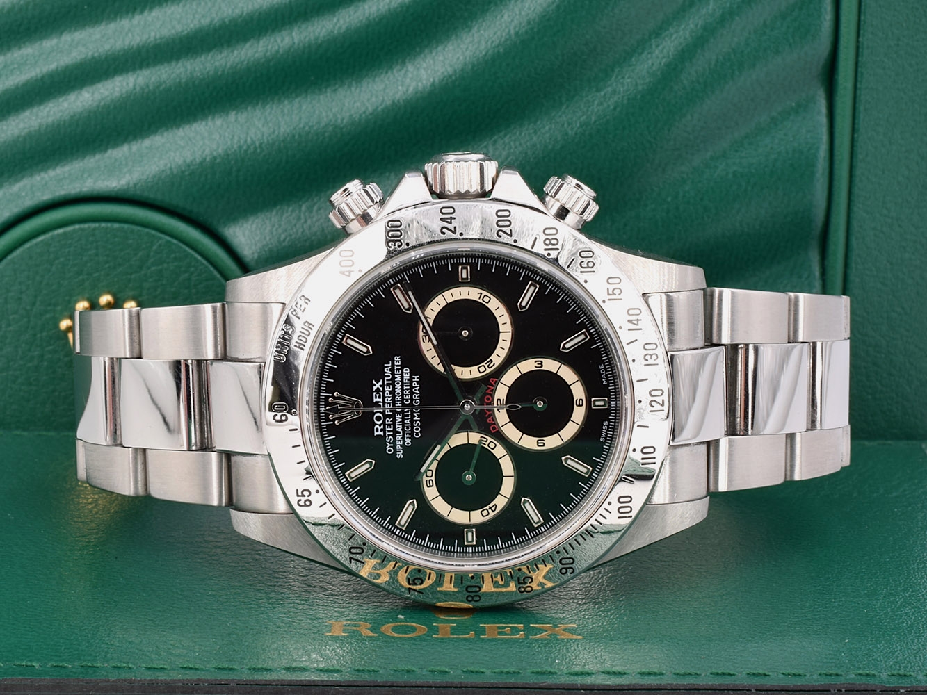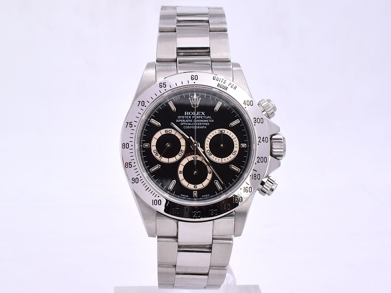 Rolex Cosmograph Daytona. Perpetual, mechanical, self-winding movement. Functions: centre hour, minute and seconds hands, small seconds hand at 6 o´clock. Chronograph (centre hand) accurate to within 1/8 of a second, 30-minute counter at 3 o´clock and 12-hour counter at 9 o´clock. Stop seconds for precise time setting. Material: steel.