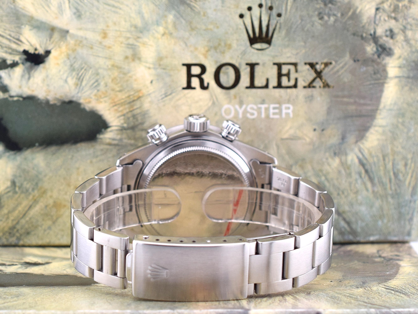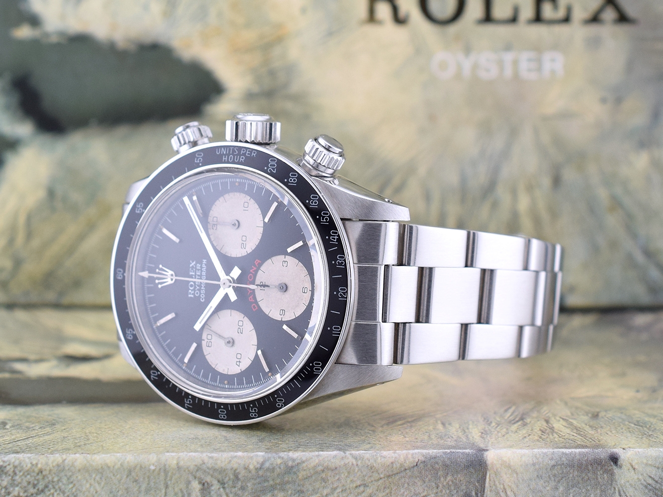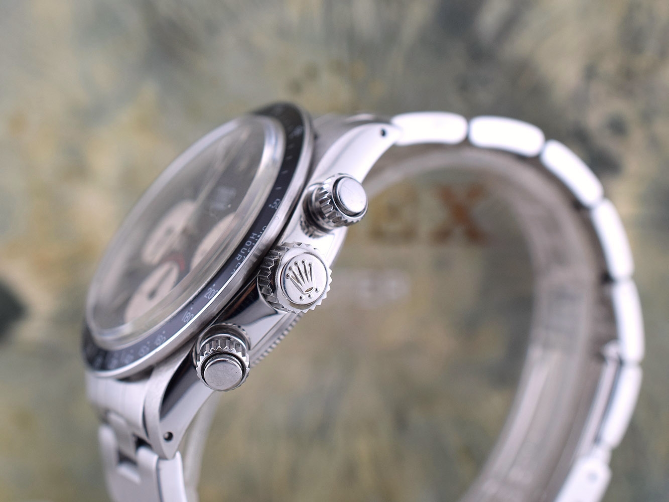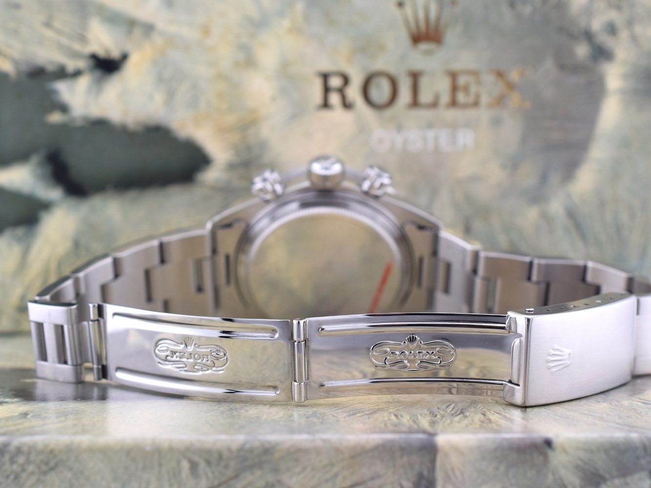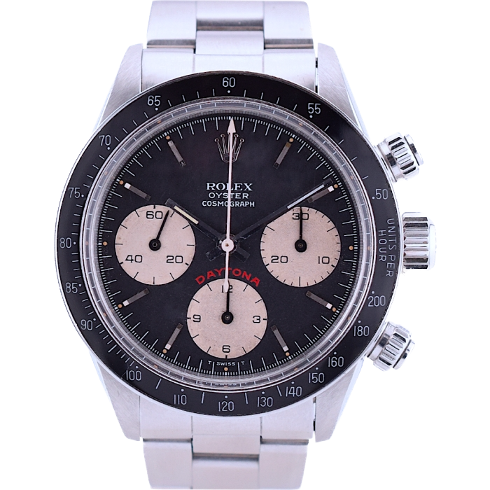 Rolex Cosmograph Daytona. Perpetual, mechanical, self-winding movement. Functions: centre hour, minute and seconds hands, small seconds hand at 6 o´clock. Chronograph (centre hand) accurate to within 1/8 of a second, 30-minute counter at 3 o´clock and 12-hour counter at 9 o´clock. Stop seconds for precise time setting. Material: steel.