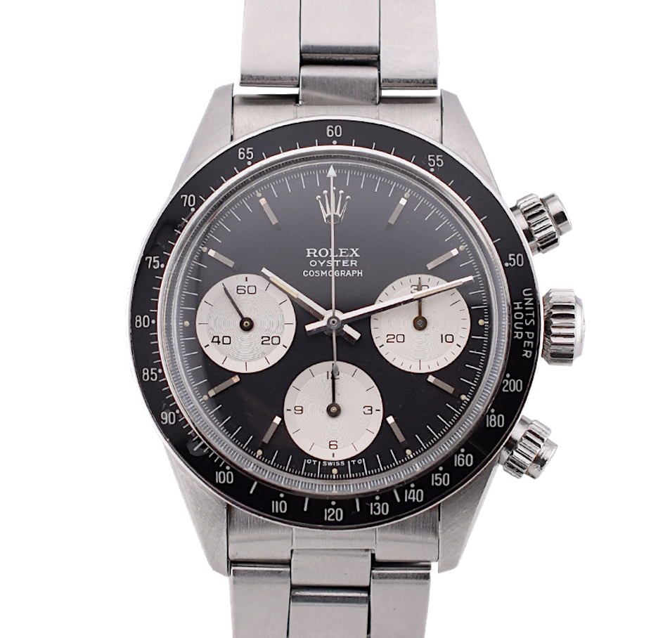 Rolex Cosmograph Daytona. Perpetual, mechanical, self-winding movement. Functions: centre hour, minute and seconds hands, small seconds hand at 6 o´clock. Chronograph (centre hand) accurate to within 1/8 of a second, 30-minute counter at 3 o´clock and 12-hour counter at 9 o´clock. Stop seconds for precise time setting. Material: steel.