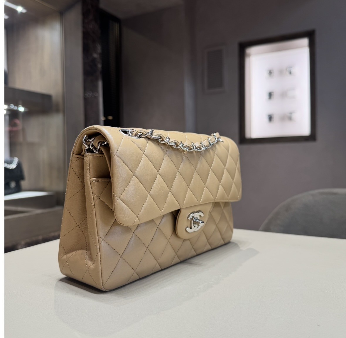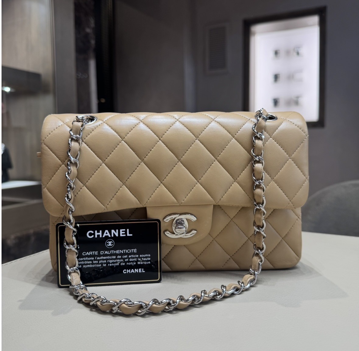 Chanel classica piccola beige in pelle di agnello con harware argento. Completa di scatola, garanzia e dustbag.