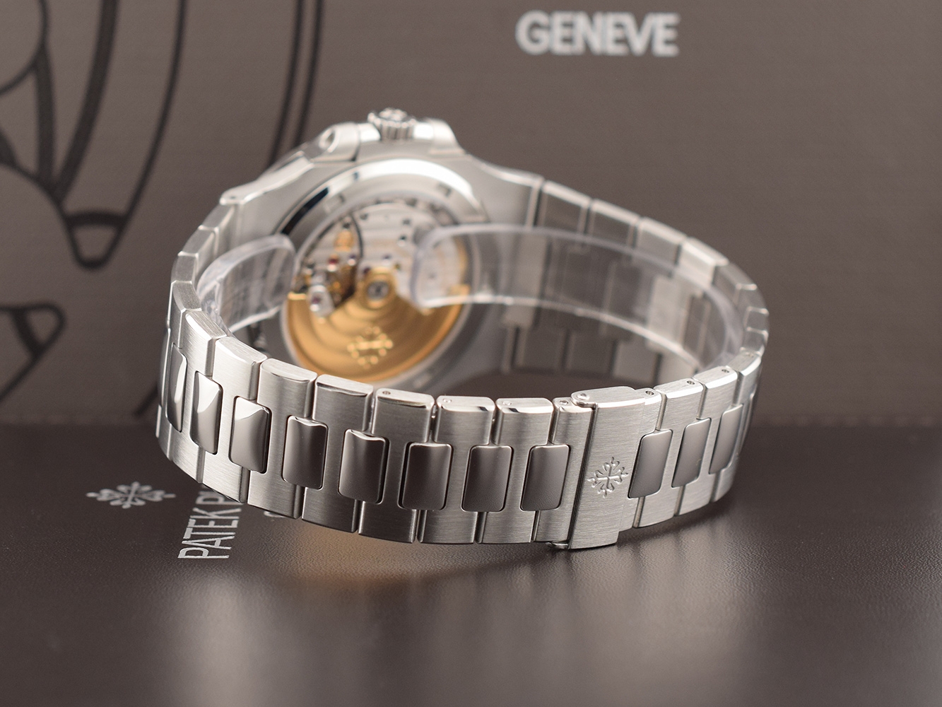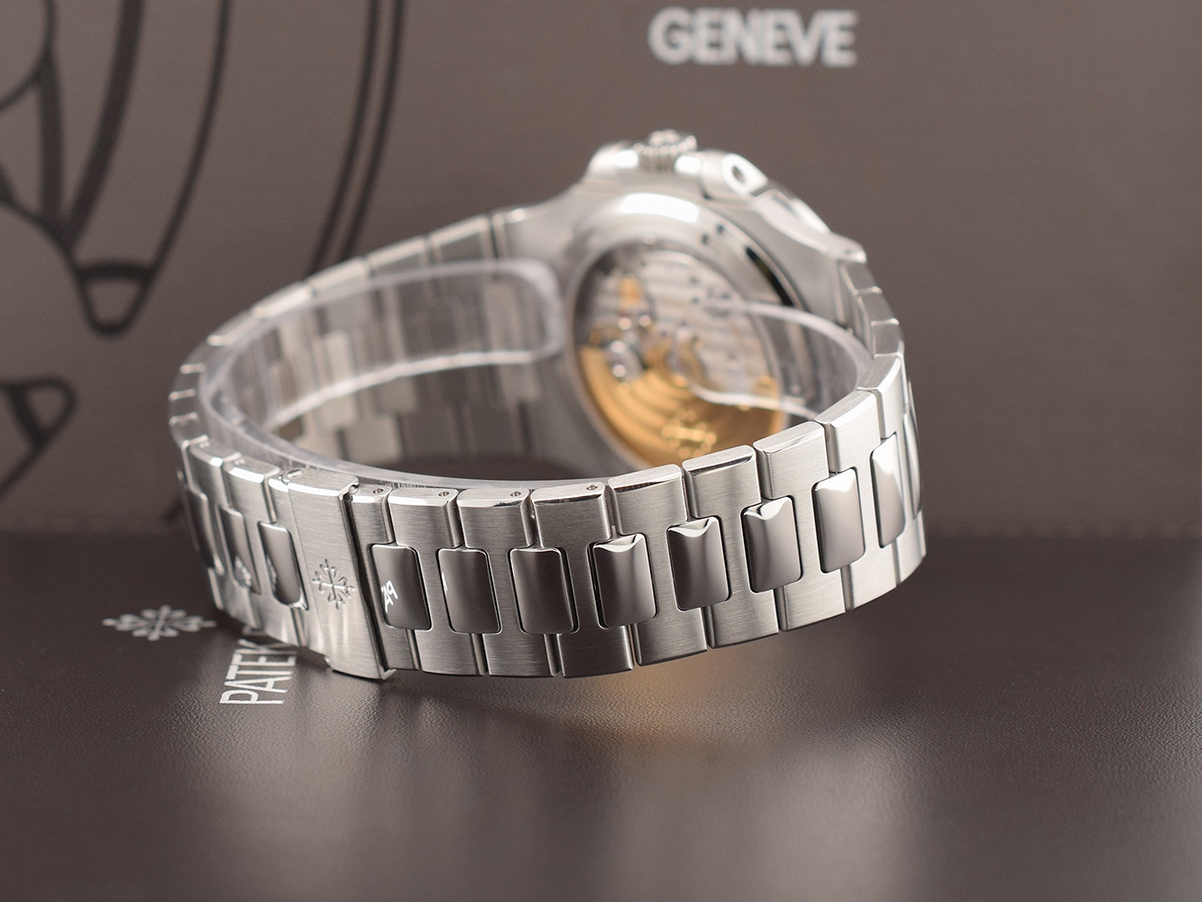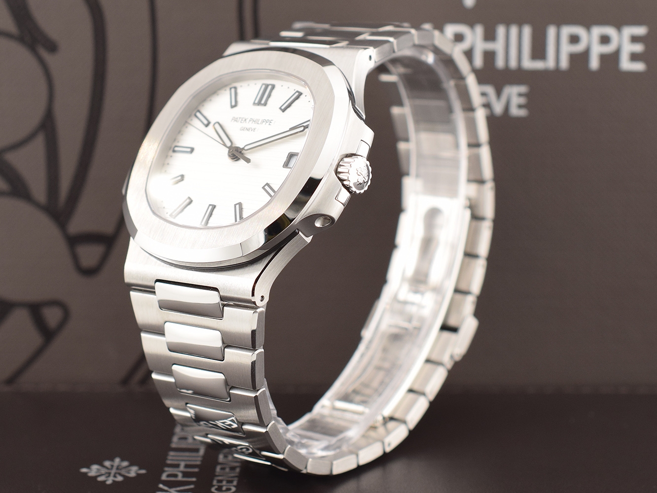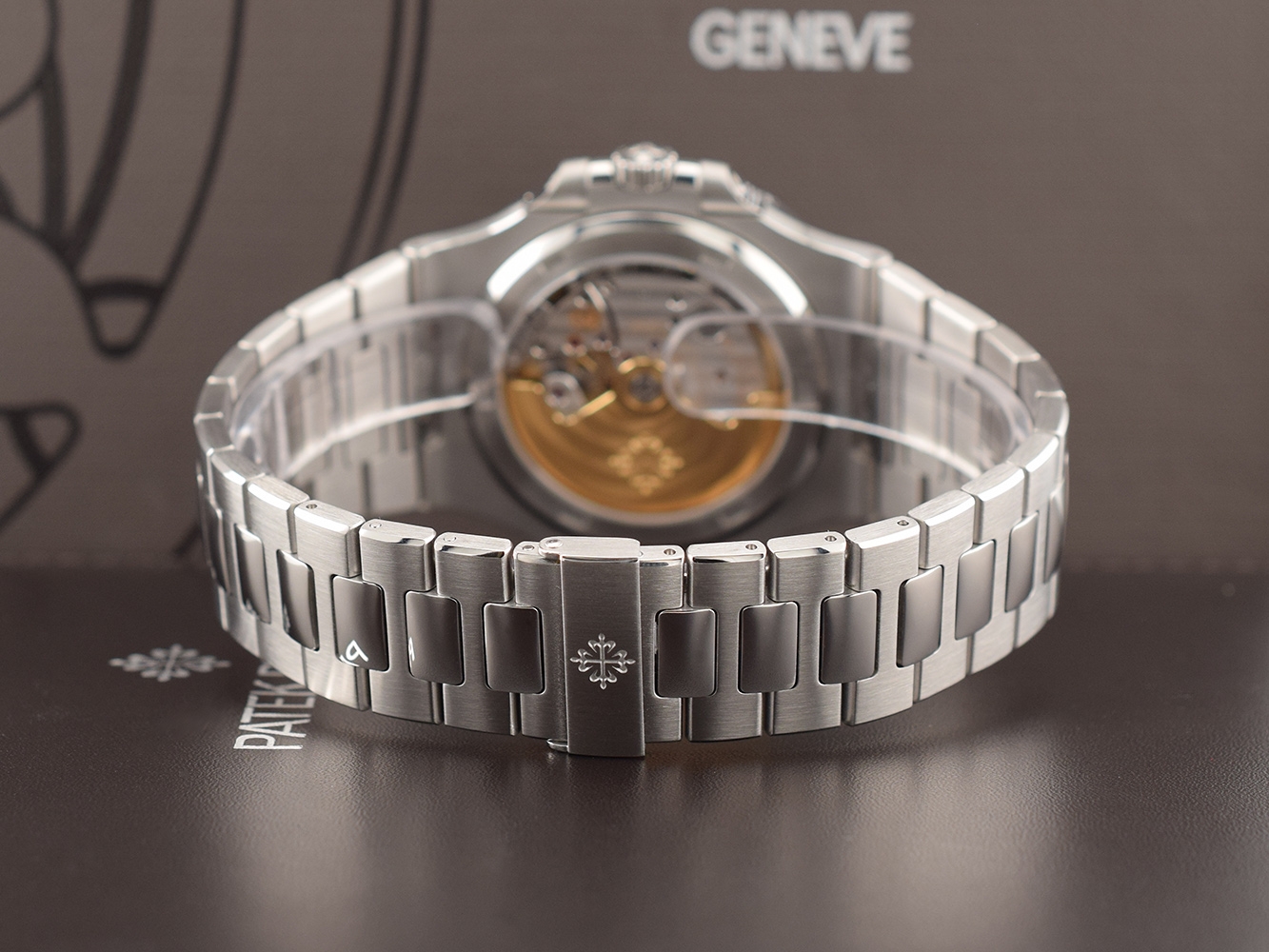 Movimento meccanico a carica automatica. Calibro 324 S C. Data a finestrella. Lancetta dei secondi al centro. Quadrante bianco argentato, indici applicati in oro con rivestimento luminescente. Bracciale in acciaio con fermaglio a « déployante » Nautilus. In acciaio. Corona a vite. Fondo cassa in cristallo di zaffiro. Impermeabile fino a 120 m. Diametro cassa (da ore 10 a ore 16): 40 mm. Spessore: 8.3 mm.