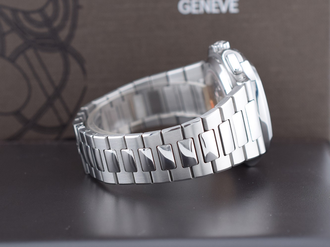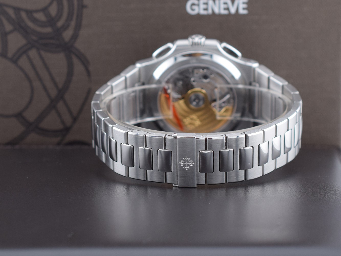 Movimento meccanico a carica automatica. Calibro 324 S C. Data a finestrella. Lancetta dei secondi al centro. Quadrante bianco argentato, indici applicati in oro con rivestimento luminescente. Bracciale in acciaio con fermaglio a « déployante » Nautilus. In acciaio. Corona a vite. Fondo cassa in cristallo di zaffiro. Impermeabile fino a 120 m. Diametro cassa (da ore 10 a ore 16): 40 mm. Spessore: 8.3 mm.