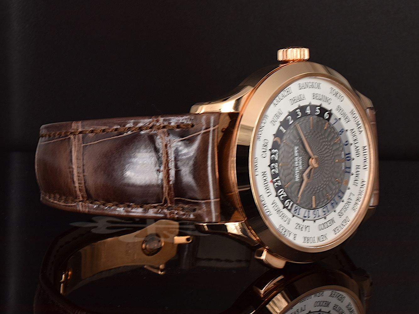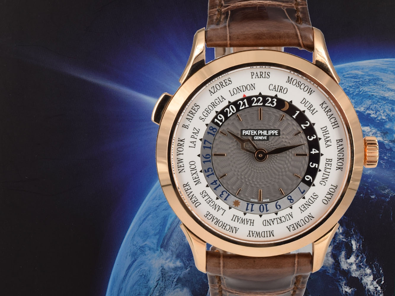 Il celebre World Time, l'orologio icona di viaggiatori e collezionisti, si rinnova con una cassa in oro rosa ridisegnata, una lancetta delle ore lavorata e dal design esclusivo Patek Philippe e un centro del quadrante laccato grigio antracite, guilloché a mano, indici applicati in oro, movimento meccanico a carica automatica calibro 240 HU. cassa oro rosa. Fondo cassa in cristallo di zaffiro. Impermeabile fino a 30 m. Diametro cassa: 38,5 mm. Spessore: 10.23 mm