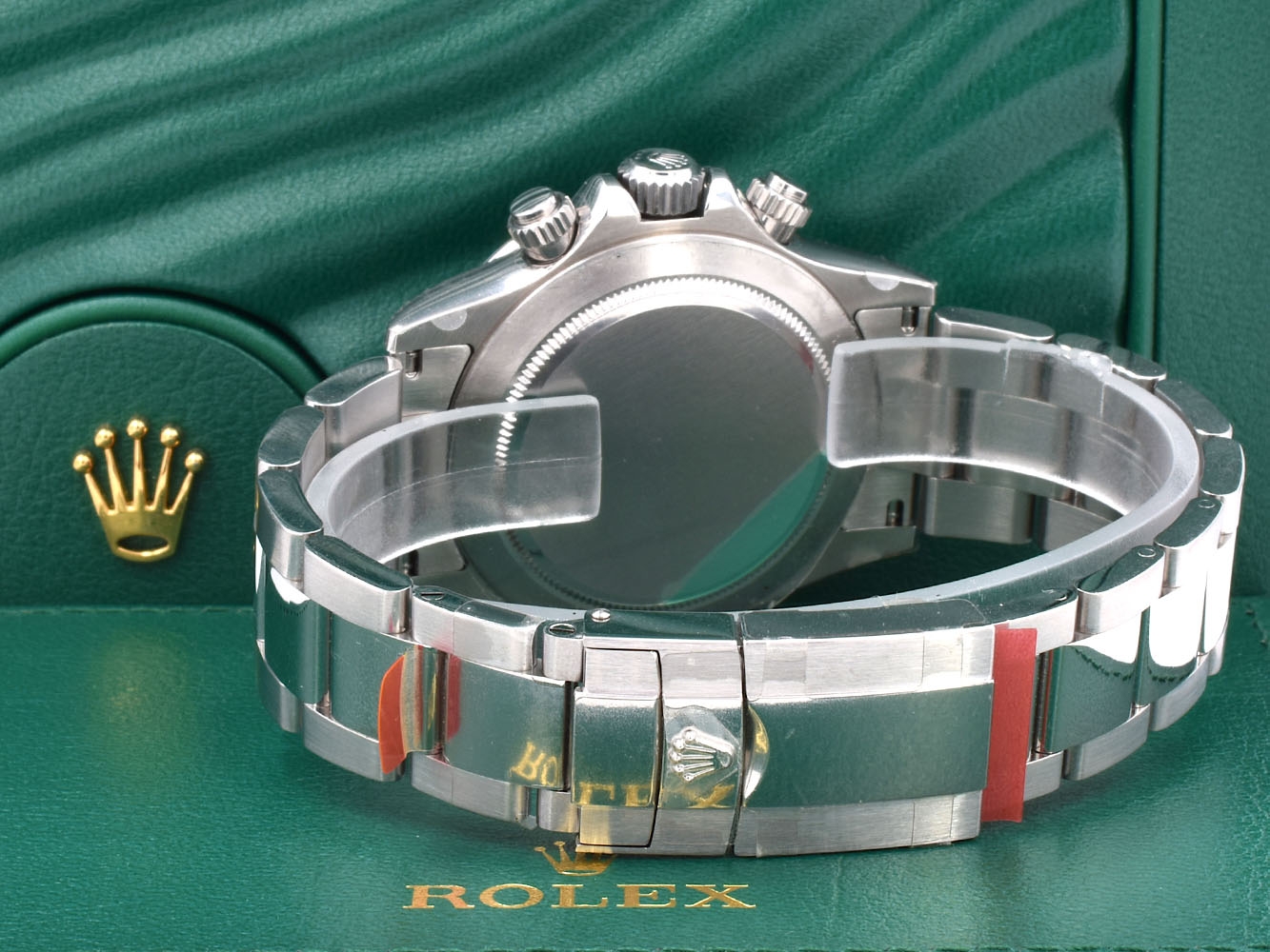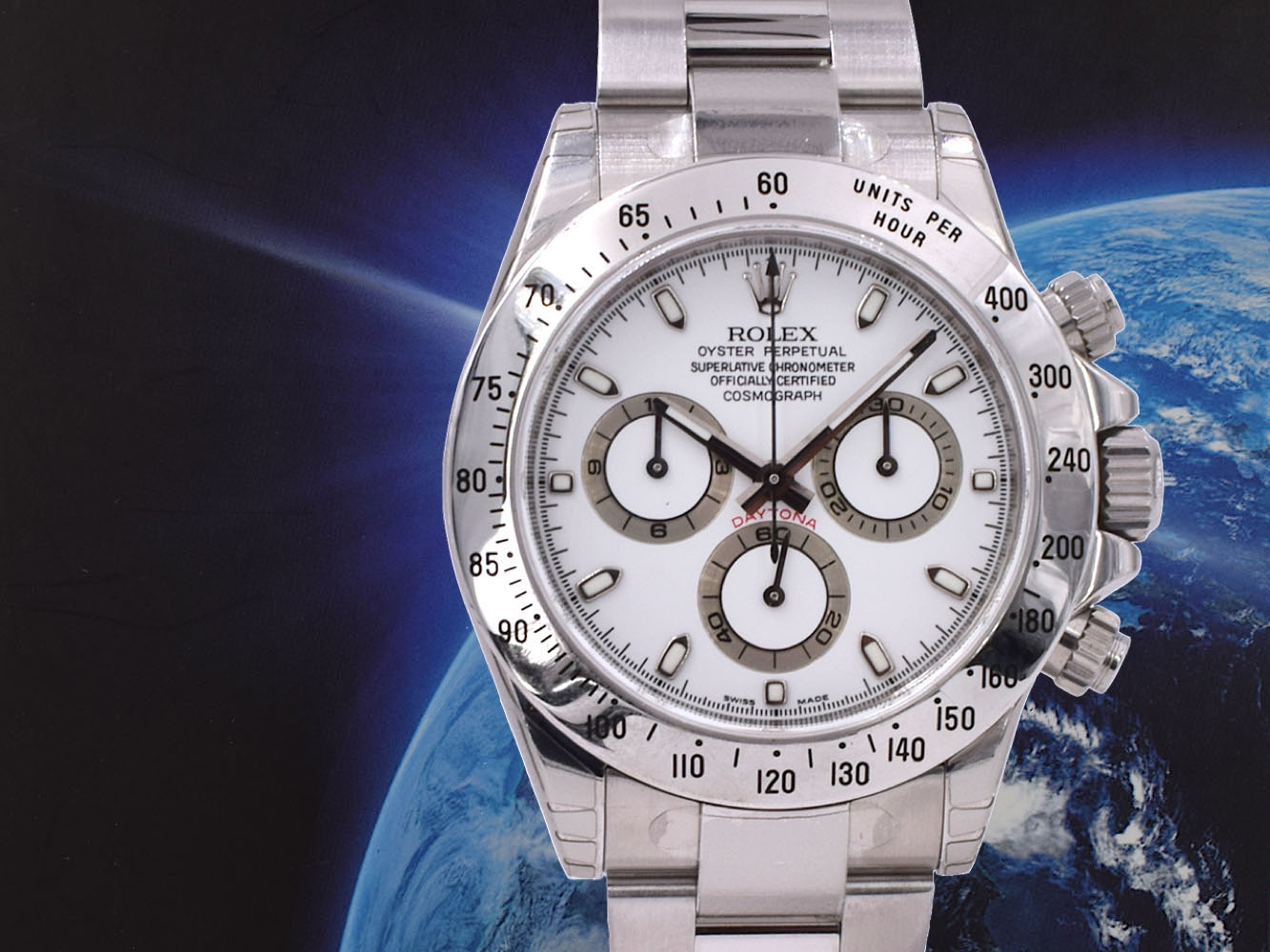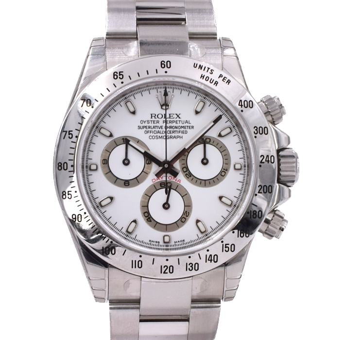 Orologio Rolex Cosmograph Daytona. Movimento perpetual, meccanico a carica automatica. Funzioni: ore e minuti al centro, piccoli secondi a ore 6. Cronografo a 1/8 di secondo mediante lancetta centrale, contatore 30 minuti a ore 3, contatore 12 ore a ore 9. Arresto dei secondi per una regolazione precisa dell´ora. Materiale: acciaio.