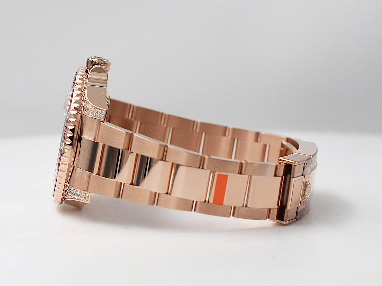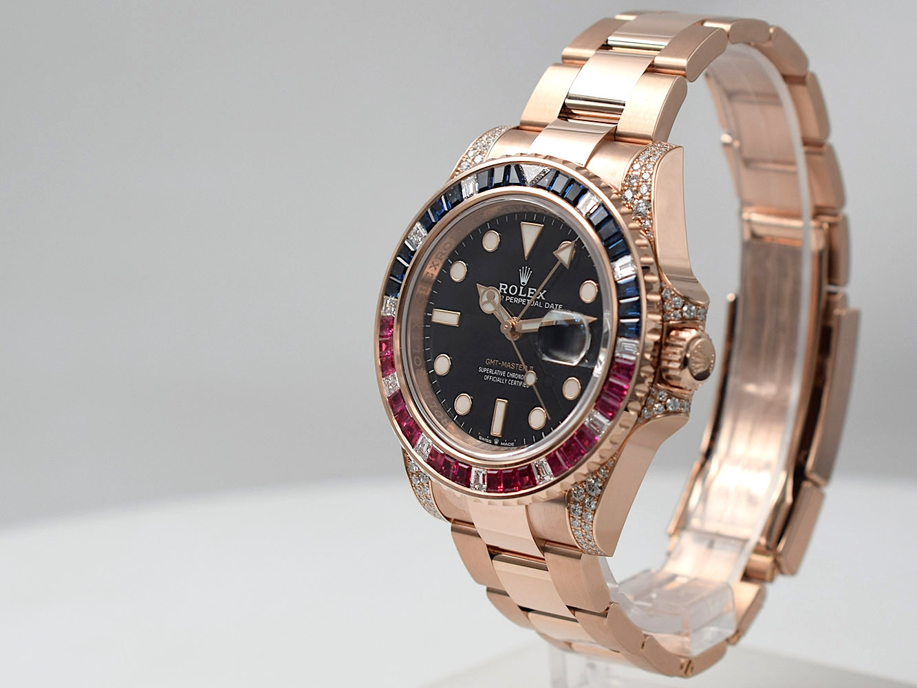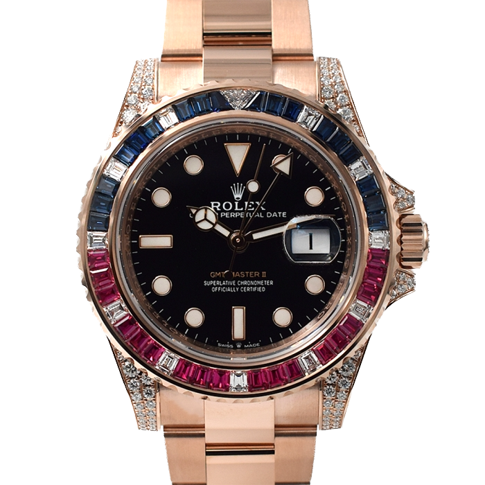 Orologio Rolex GMT-Master II, oro rosa, nuovo mai indossato. Benché inizialmente ideato per fini puramente professionali, grazie alla sua impareggiabile funzionalità e al suo aspetto robusto, il Rolex GMT‑Master ha subito sedotto un’ampia gamma di viaggiatori, non solo per la possibilità di visualizzare l’ora in diversi fusi orari, ma anche per la solidità e la versatilità di questo modello, che lo rendono uno strumento ideale sia per i viaggi che per le occasioni di tutti i giorni.